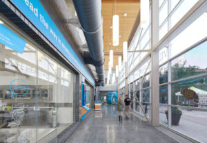 The five-story, 415,000 square foot building is perched along the shores of Lake Michigan, with views of Chicago’s skyline. It was designed by the Toronto-based architectural firm KPMB to be a catalyst for creative and collaborative thinking. The design features a variety of learning and networking spaces, including a central atrium, a two-story auditorium, classrooms, a conference center and a multitude of places to gather.